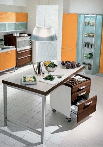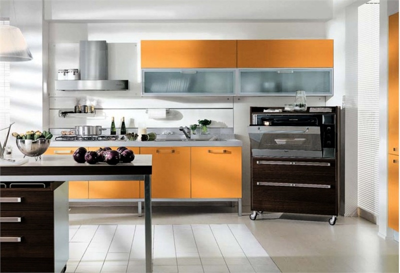 Petra kitchen from Italian manufacturer Pedini. The frame is made of particle Board in melamine finish. Doors are made by laminating, veneer of walnut or bleached oak, Matt or glossy lacquer, directed the glass in an aluminum frame. Stainless steel countertop, granite, marble, artificial stone, or composite material Cristalan. Colours - white, brown and orange.
