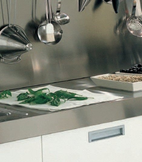Petra kitchen from Italian manufacturer Pedini. Kitchen set on a frame of chipboard to finish melamine, wood veneer, lacquer. Stainless steel countertop, granite, marble, artificial stone, or composite material Cristalan. The model contains a table with legs which is hidden in a special niche. Colors - white, steel and brown.