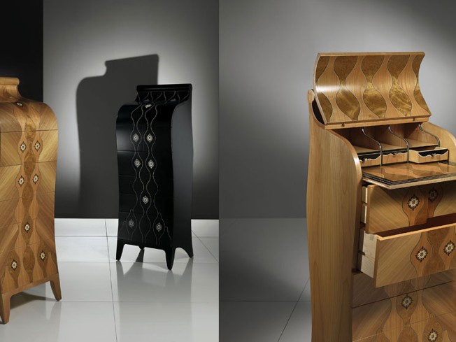 Bureau SILOUETTE from the Italian manufacturer Carpanelli. High model with drawers. This elegant, functional piece of furniture features a thin, meandering line. Made of ebony wood with geometric inlays with mother of pearl. Lifting the top cover, which provides a pull-out shelf and small drawers. There is a hiding place.