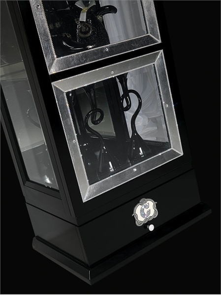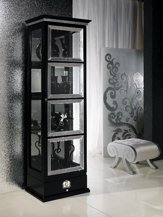 Showcase DECO QUADROTTI with one leaf from the Italian manufacturer Carpanelli. The frame is made of wood, finished in black glossy lacquer, with beveled glass with a border of silver foil, and Swarovski crystals. Provided the drawer handles are decorated with Swarovski crystals.