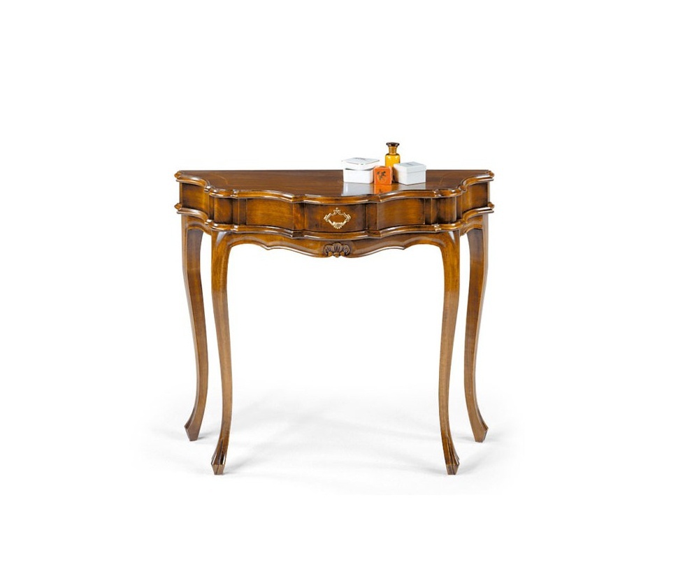 Console in classical style Rialto, Selva. The presented model color natural wood with drawers. The frame is made from Tulip tree. Legs made of beech wood, decorative metal fittings. The entire surface is lacquered.