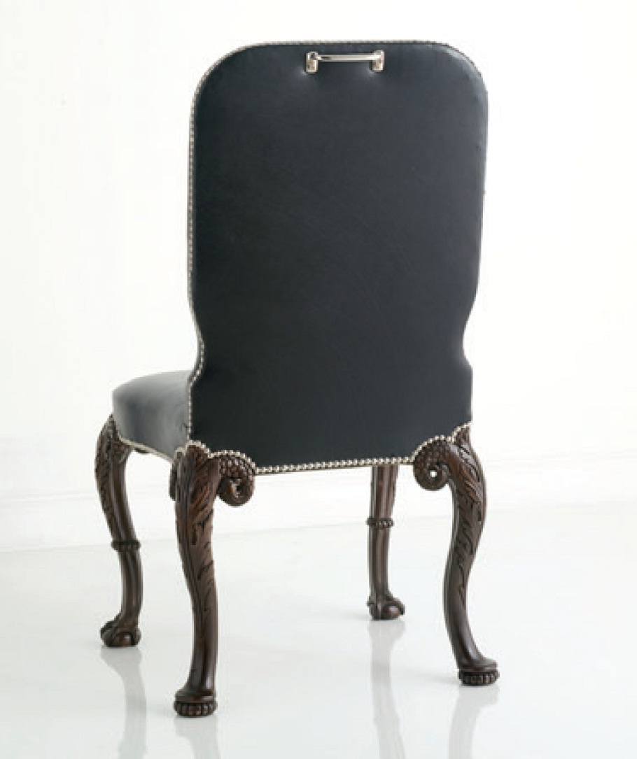 Chair in leather upholstery from Italian manufacturer Chelini. This indicator is based on a frame of solid wood. For upholstery, use leather or cloth according to manufacturer's catalogue. Decoration are the hand carved legs and decorative metal rivets, and the handle on the rear of the backrest, it will serve as a perfect helper for easy carrying of the product. The model is executed in classical style.