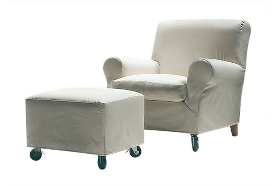 Nonnamaria chair from the Italian manufacturer Flexform. The frame is made from solid wood, the seat upholstery - polyurethane foam, the filler of back cushions - Pooh. Seat cover leather or fabric from the company portfolio. The model with wheels is supplemented by a stool for the feet. Excellent model in a contemporary style.