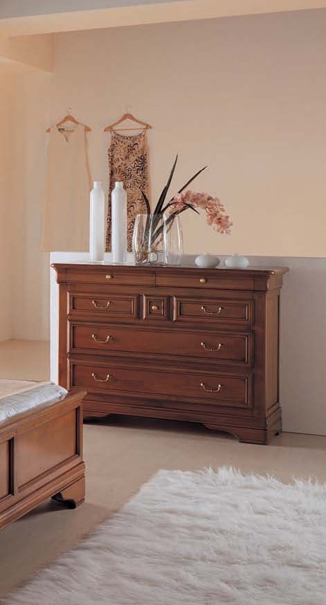 A chest of drawers with drawers of different sizes, from the Italian manufacturer Selva. The basis of a frame made of alder, finished with cherry wood. The facade is made by manual work. Product color natural wood. The style is classic.