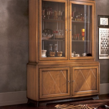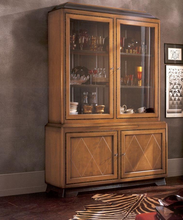the doors are made of glass. Handles are metal. This snack bar is made in classic style. Visually, the buffet is divided into two parts, decorative and stylistic techniques.