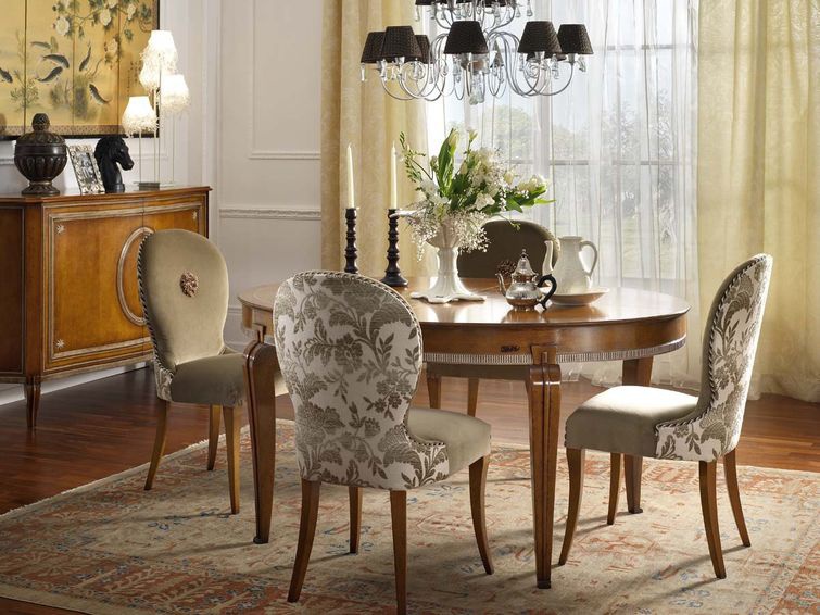 Dining table from the Italian manufacturer Pregno. The proposed round table model is executed in classical style. The table top and the legs are made of durable solid wood and covered with lacquer. The company offers natural wood color. Dining table, with carved top and shaped legs. Perfect for home and office space.