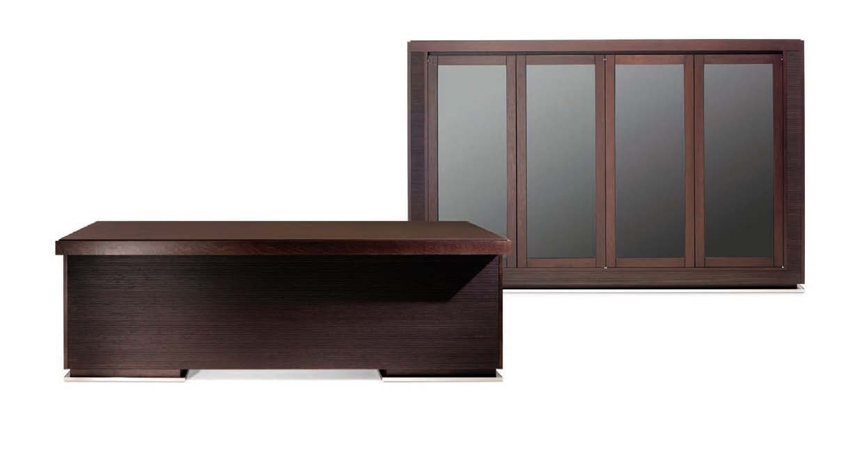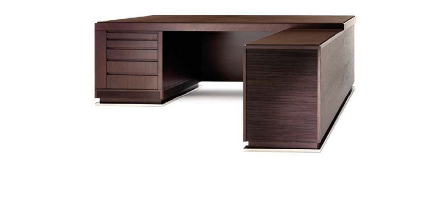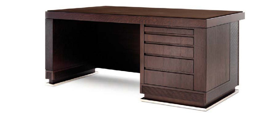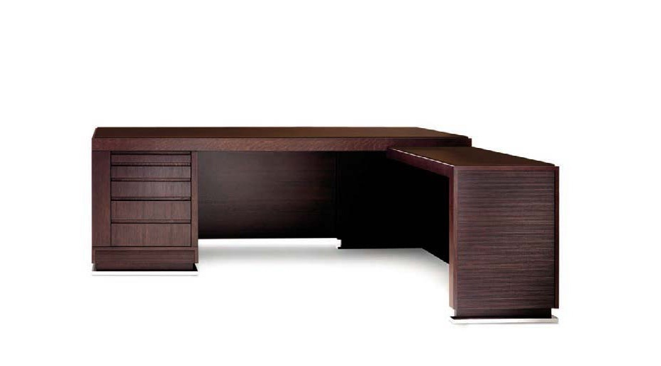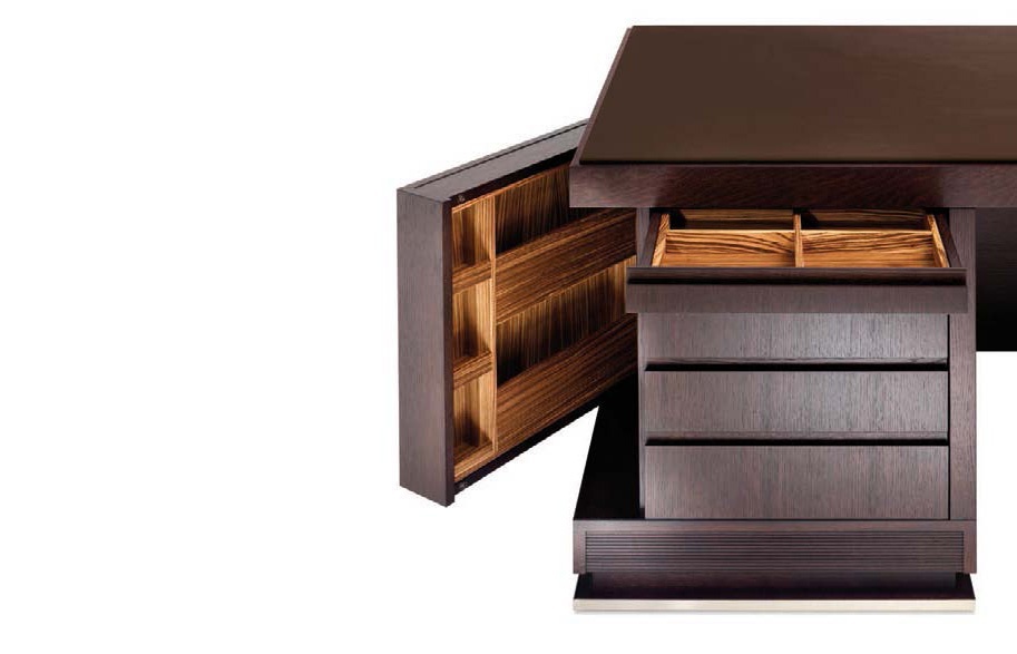 Corner Desk Scrivania con dattilo ICS from the Italian manufacturer Ceccotti. The frame is made from oak wood, trim - Zebrano. The tabletop is upholstered in leather. Finish - Nickel. Colours in stock. The perfect choice for the Manager's office in the art Deco style.
