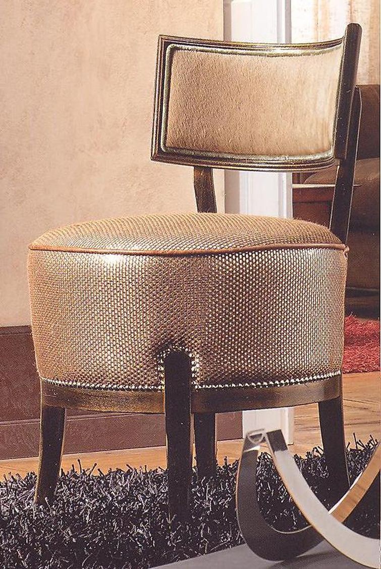 A chair from the Italian manufacturer Pregno. The frame of this chair is made of solid wood. The round chair without armrests. Color scheme from the manufacturer in mustard color. Chair on wooden legs with a hard cushion upholstered in leather. A beautiful combination of dark brown wood and textiles.