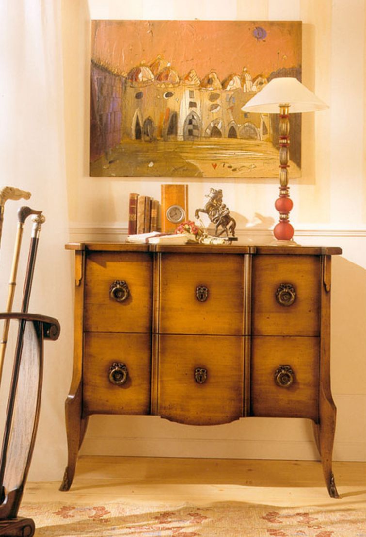 Wooden chest of drawers from Italian manufacturer Pregno. The model with six drawers finished with metal fittings. A chest of drawers on small feet figure. Body of this model is made of wood, metal pens, model varnished. This functional piece of furniture is made in classic style. Color scheme from the manufacturer in a mustard tone.