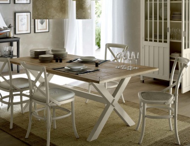 Dining table in country style — rectangular. Around the table — a simple heavy chairs in country style or even the bench. Decor: wooden roosters, sheaves of wheat, bunches and wreaths of wild flowers.