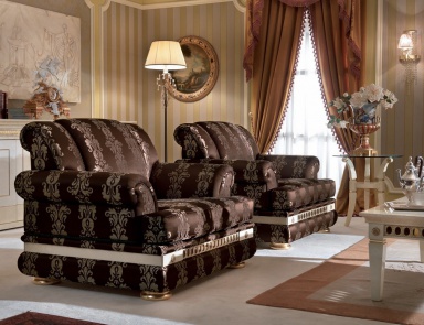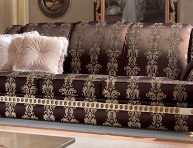 Frame of sofas and armchairs made of wood, decorated with glossy finish color is "ochre" with the effect tamponato. Upholstery – luxurious textile that looks very impressive and expensive. Turned armrests give products a unique elegance. "Highlight" of the models are wooden strips with tinted glasses.