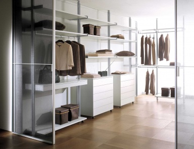 Modern walk-in closets include aluminum racks with oval, circular or rectangular cross-section with fasteners in rips of different types such as ceiling-floor, wall-floor, wall-wall. A standard or a corner walk-in closet of this type has a bar for clothes, open and closed boxes, shelves made of glass, chipboard and other materials.